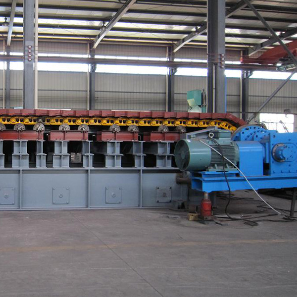 El reductor que es accionado por el motor y el acoplamiento acciona el árbol de ruedas dentadas para que gire. Se adopta el modo de transmisión de la estructura de la cadena de ruedas dentadas. El mecanismo de cadena de ruedas dentadas puede funcionar en malas condiciones de trabajo, y se caracteriza por una carga pesada y baja velocidad, lo que puede completar el transporte de objetos pesados, y arrastrar la placa de cadena para moverse a lo largo de una línea recta a través de la cadena. La placa de cadena está montada sobre el rodillo de soporte y el rodamiento de rodillos de soporte. La cadena necesita dispositivos de tensionamiento correspondientes para asegurar el acoplamiento correcto entre la cadena y la rueda dental para completar el propósito de transporte de material.