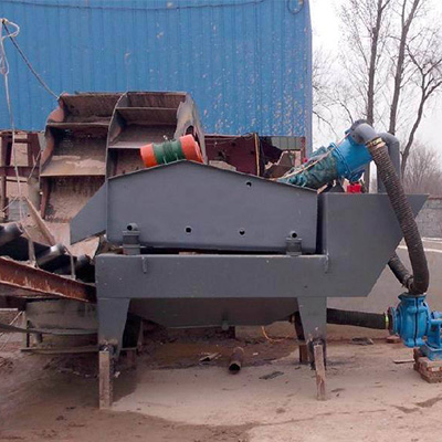 La máquina de recogida de arena se compone de motor, bomba de arena, separador centrífugo, pantalla de deshidratación lineal TS, tanque de limpieza, tanque de retorno y así sucesivamente. Cuando está trabajando, la bomba de arena pone la mezcla de agua de arena entregada al separador centrífugo, la arena fina concentrada a través de la boca de arena para la pantalla vibradora. Después de la deshidratación por pantalla vibratoria, la arena fina y el agua se están separando, una pequeña cantidad de arena fina y arcilla vuelven al tanque de limpieza para lavar, cuando la superficie del tanque es demasiado alta, el producto se está descargando. El tamiz de deshidratación lineal recupera la concentración del material del 70% al 85%. El ajuste del módulo de finura se puede lograr cambiando la velocidad de la bomba de arena, cambiando el mortero, ajustando la cantidad de desbordamiento y cambiando la boquilla de descarga de arena. Completa así las funciones de lavado, deshidratación y clasificación.