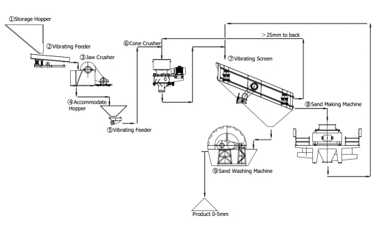 El flujo para la planta de fabricación de arena: (tolva) -> Alimentador vibrador-> Trituradora de mandíbulas finas -> Trituradora de mandíbulas finas / Trituradora de impacto / Trituradora de conos -> Máquina de fabricación de arena -> Pantalla vibradora -> Lavadora de arena-> (arenas). Las máquinas están conectadas por canales o cintas transportadoras.
